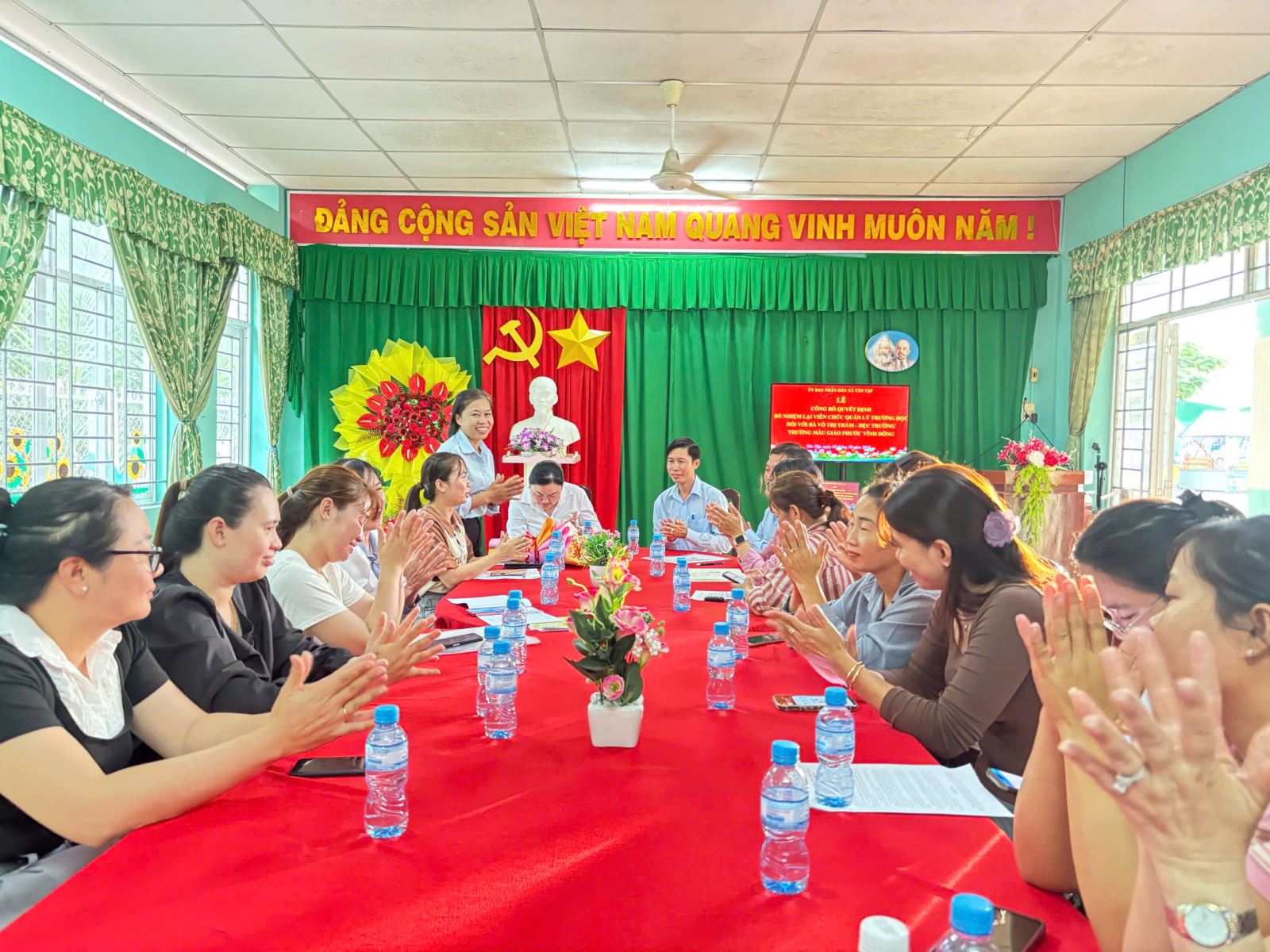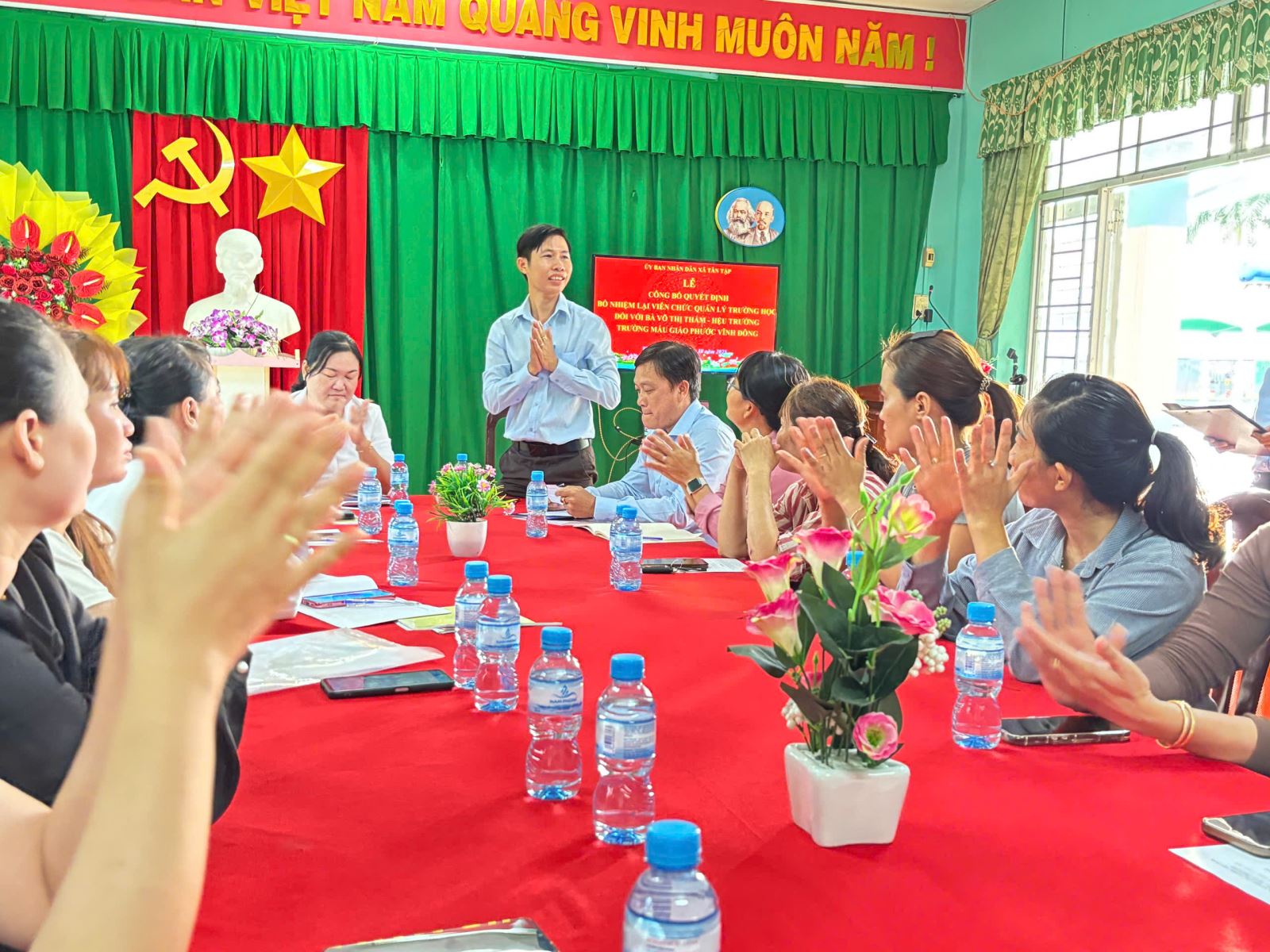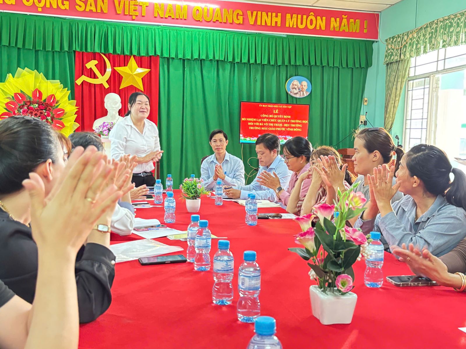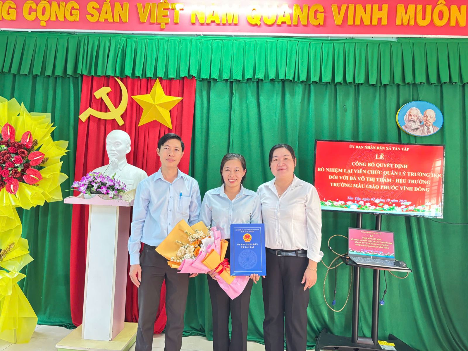 Ngày 03/10/2025 Ban xây dựng Đảng và Phòng VHXH xã Tân Tập trao Quyết định bổ nhiệm lại viên chức quản lý Trường học đối với Bà Võ Thị Thắm- Hiệu trưởng Trường MG Phước Vĩnh Đông, nhiệm kỳ 2025-2030.